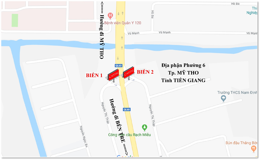 -Vị trí biển: Biển quảng cáo nằm tại chân cầu Rạch Miễu, thuộc địa phận phường 6 - Tp Mỹ Tho, tỉnh Tiền Giang, đây là cây cầu độc đạo phá vỡ thế cô lập của tỉnh Bến Tre. Cầu Rạch Miễu đóng vai trò kết nối thông thương huyết mạch bằng giao thông bộ giữa tỉnh Bến Tre sang các tỉnh lân cận