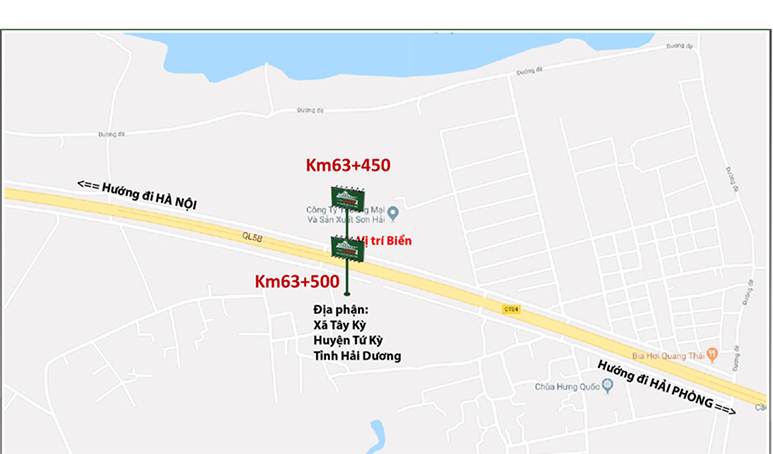 -Vị trí biển: Vị trí nằm tại cột mốc KM 63+450 (bên trái) và KM 63+500 (bên phải) - Cao tốc Hà Nội - Hải Phòng. Biển được dựng tại dải đất 2 bên đường cao tốc, theo hướng Hà Nội đi Hải Phòng. Vị trí đặt cột thuộc địa phận huyện Tứ Kỳ, tỉnh Hải Dương. Cột biển đặt theo mép đường gom 25m. Hai biển được dựng hai bên đường cao tốc tạo thế cổng chào, đem lại hiệu quả quảng cáo trực quan, rõ ràng